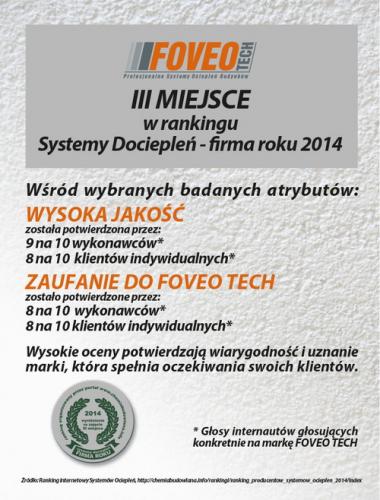 Profesjonalne produkty do ociepleń budynków marki FOVEO TECH zostały docenione przez internautów w rankingu SYSTEMY OCIEPLEŃ - FIRMA ROKU 2014, w którym udział wzięło 18 producentów, FOVEO TECH zajęło wysokie, 3 miejsce.