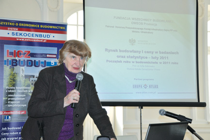 Bardzo interesujące było wystąpienie prof. Zofii Bolkowskiej, która mówiła o koniunkturze budowlanej w styczniu b.r. Jak się okazuje, widać już pierwsze oznaki poprawy sytuacji w gospodarce po kryzysie, ale budownictwo jest sektorem, który jako pierwszy odczuwa kryzys i jako ostatni z niego wychodzi. Mimo to, w styczniu b.r. budownictwo osiągnęło wzrost 11,2% w stosunku do stycznia 2010. Należy jednak pamiętać, że baza do której się odnosimy – styczeń 2010, była bardzo niska. W styczniu 2011 roku odnotowano wzrost zatrudnienia o 7,6% (w stosunku do roku ubiegłego) i wzrost płac w budownictwie (o 4,2%), szczególnie w przedsiębiorstwach realizujących roboty infrastrukturalne. Może to oznaczać przygotowanie do natężenia prac w najbliższych miesiącach, gdy poprawią się warunki atmosferyczne. W styczniu utrzymywała się, obserwowana już w drugiej połowie ubiegłego roku, zwiększona aktywność inwestycyjna w budownictwie developerskim, jak też inwestorów indywidualnych. Należy oczekiwać wzrostu ilości mieszkań oddawanych do użytkowania, a także przyspieszenia robót budowlanych.